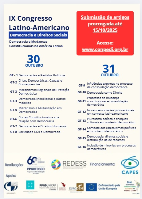 A comissão organizadora informa que o prazo para submissão de artigos ao IX Congresso Latino-Americano sobre Democracia e Direitos Sociais, que será realizado na Faculdade de Direito de São Bernardo do Campo (FDSBC) de 28 a 31 de outubro de 2025, foi prorrogado até o dia 15 de outubro de 2025.
