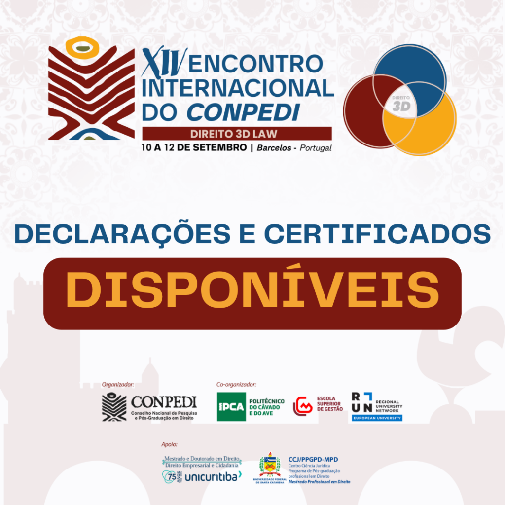Participante do XIV Encontro Internacional do CONPEDI, você já pode visualizar e baixar o seu certificado e/ou declaração relativo ao evento em Barcelos, Portugal. Lembre-se que o certificado só é emitido para aqueles que participaram de, ao menos, 75% do evento. Já a declaração de apresentação é fornecida apenas para aqueles que devidamente apresentaram seus artigos e assinaram a lista de presença.